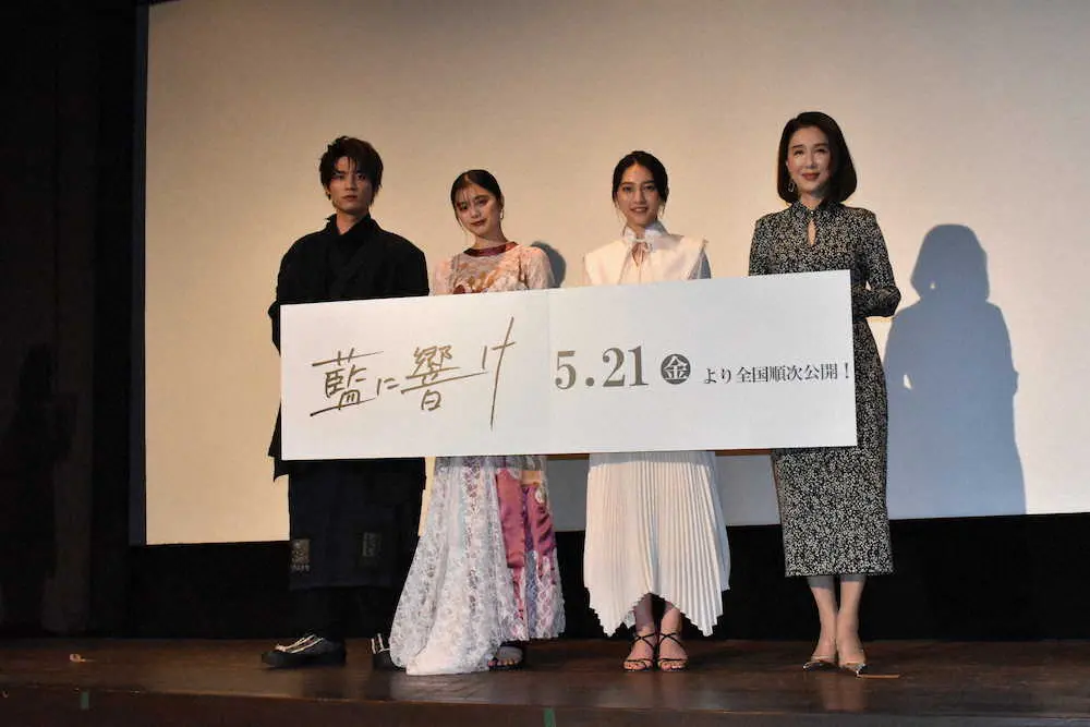 映画「藍に響け」の公開舞台あいさつに登場したキャスト陣(左から)板垣瑞生、紺野彩夏、久保田紗友、筒井真理子(撮影・小田切 葉月)