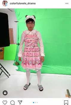 レースのヘアアクセサリーとブラウス、ピンクのフリルやリボンがあしらわれたワンピースに、白タイツという可愛らしいコーディネートだが、ロリータテイストには似つかわしくない黒のサンダルに、表情は真顔でシュールな見た目になっている。
