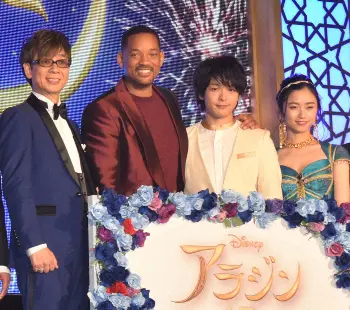 実写版「アラジン」公開前イベントに出席した(左から)山寺宏一、ウィル・スミス、中村倫也、木下晴香(2019年撮影)