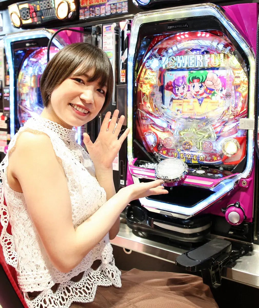 「Pフィーバーパワフル」を前にポーズをとる大崎由希
