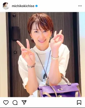 「次女目線にて」という短いコメントとともに、自身の写真を投稿。黒のトップスに、紫のバッグに、笑顔でダブルピースをしている爽やかな1枚になっている。