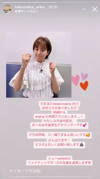 これを受け、徳島アナはストーリーを更新。「さきほど、news every.内でお知らせがありましたが 来週からnews every.に仲間入りいたします...! わたしは木金の担当、月~水は中島芽生アナウンサーです」と報告。中島アナは現在、木・金曜日を担当している。