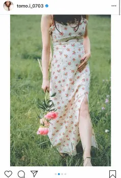 これまでの投稿では、“ピクニック風”ショットなどを披露してきた板野。今回は、「#love」とハッシュタグをつけ、草花が咲いている場所に立ち、裾にスリットが入った花柄のワンピースを着た全身ショットをアップ。ピンクの花束を片手に、笑顔を見せている。