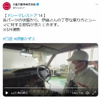 日産自動車が公式ツイッターを9日、更新し、女優・伊藤かずえ(54)が30年連れ添っている愛車「1990年式 日産シーマ」のレストア作業の様子を公開。担当者が状態の良さに驚く場面があった。