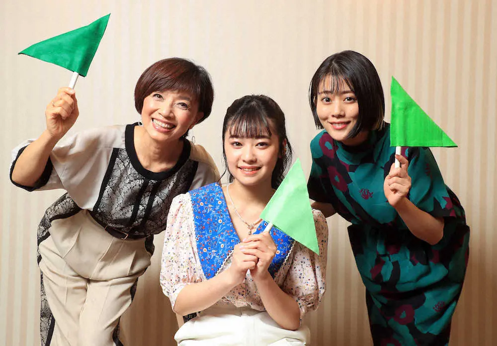 それぞれピーターパン役で着た、衣装色の旗を手に笑顔を見せる(左から)榊原郁恵、吉柳咲良、高畑充希(撮影・久冨木 修)