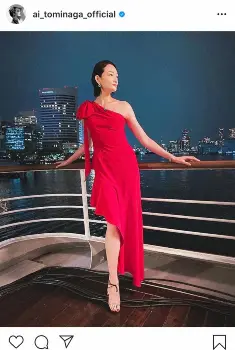 「Red Dress」とコメントし、船上と思われる場所で、夜景を背に柵に手を置き、ポーズを決めた姿を披露。肩とスラリと伸びた右脚を見せた、スタイルが際立つワンショルダーの赤いドレスに身を包んだ富永は、凛とした表情で目線を遠くの方へ向けている。