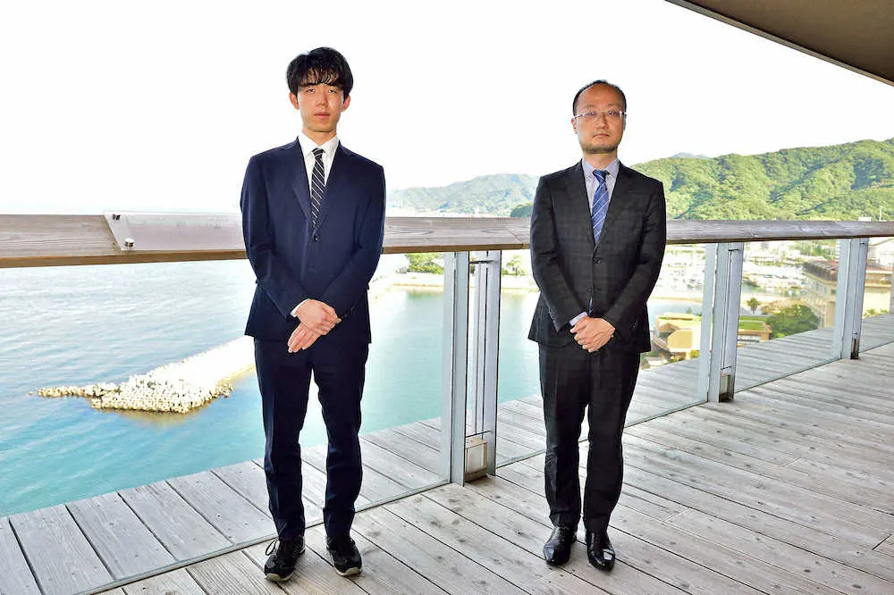 棋聖戦第2局に備え、兵庫県洲本市に入った渡辺明王将(右)と藤井聡太2冠(提供・日本将棋連盟)