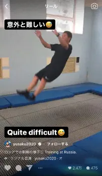「こんな訓練もします」とつづり、トランポリンを使いながら、背中から倒れて起き上がる動画を投稿。途中バランスを崩しながらも、トレーニングを続ける前澤氏は「意外と難しい」「いろんなとこ擦りむいた」とコメントした。