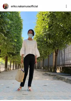 「週末に家族で劇場に行った時のスタイル!」と記すと、襟なしで、袖の部分が広がった白いブラウス、黒のパンツ、白で花柄の入ったフラットシューズにバッグを持った姿を披露。「ロックダウンで何度も延期になっていたので、やっと」と観劇の喜びをつづると、「観劇後は散歩するだろうなぁって予測してペタンコ靴で!!」と街を歩く準備をしていたことも明かした。また「ブラウスはdeuxclefs!!」と中高の同級生が立ち上げたブランドであることも紹介し、ハッシュタグでは「同級生のブランド」「白ブラウス」「家族時間」「観劇」「パリのおうち時間」「素敵な週末を」と添えた。