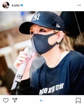 「My brand new microphone 」とコメントし、シルバーや黒のラインストーンで、自身の名前の頭文字である“A”のロゴマークがデコレーションされたマイクを披露。身につけているキャップやマスク、トップスは黒で統一されている。