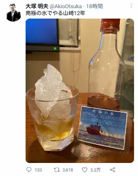 大塚は「南極の氷でやる山崎12年」とつづり、「南極の氷」の説明が書かれたカードを添えたグラスの写真を投稿。