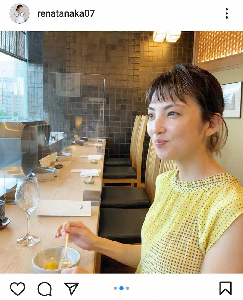 田中はイエローを基調とした夏らしいワンピース姿で、カウンター席で食事を楽しむ自身のショットを披露。「夫にたまにはデートがしたいんだとリクエストして、本当に久しぶりに二人だけでランチをした日」の写真と明かし、「何が食べたいか聞かれて、天ぷらをリクエストしました。いつも追い立てられるように食べてるので、味わって食べなきゃと噛み締めてる私」と続けた。