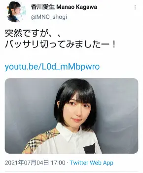 香川愛生女流四段公式ツイッター(@MNO_shogi)より 美人棋士の香川愛生女流四段 バッサリ前下がりボブに「黒髪美少女」「凛… ギャラリーで見る この記事のフォト 2021年07月04日の画像一覧 もっと見る 2021年07月04日の画像をもっと見る