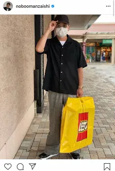 「アウトレットて足を鍛える所やん」「10000歩いってるやん」とコメントし、アウトレットでの買い物で歩き回ったことを明かしたノブ。黒のキャップを被り、サングラスにマスクをして、軽やかな素材の半袖シャツとチェック柄のパンツを合わせたコーディネートを披露し、左手には黄色の「LEGO」とロゴが入った大きな袋を手にしている。