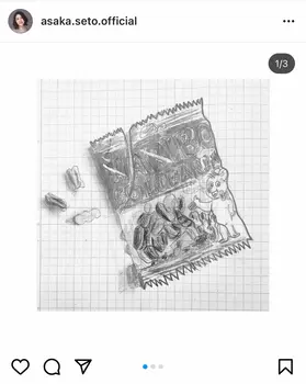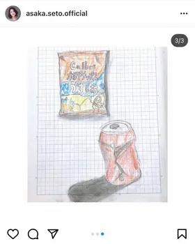 「今日は息子の作品」とつづり、3枚の写真を投稿。1枚目は、お菓子の袋を描いたもので、2枚目はその絵に着色したもの。3枚目では、お菓子の袋と空き缶を描いた絵を披露した。いずれの絵も巧みに影をつけ、立体感のある作品となっている。