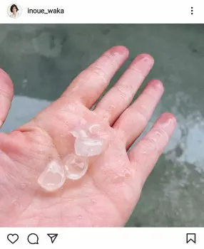 この日、東京では4時ごろからひょうが混じった雷雨に見舞われた。井上は手にひょうを乗せた写真とともに「さっきの大雨で大きな雹が降ってきてビックリ!」「#こんな大きくてビックリ」とつづった。