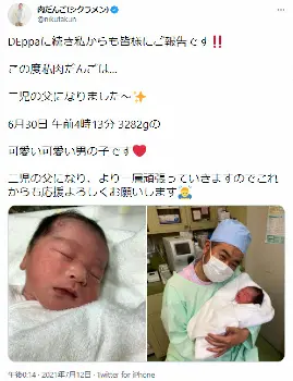 「DEppaに続き私からも皆様にご報告です!!この度私肉だんごは…二児の父になりました~6月30日 午前4時13分 3282gの可愛い可愛い男の子です」と報告。「二児の父になり、より一層頑張っていきますのでこれからも応援よろしくお願いします」とつづり、赤ちゃんとのツーショットを投稿した。