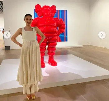 「#KAWSTOKYOFIRST 明日からです」とつづり、背中見せの白ワンピース姿でモニュメント近くで撮った写真などをアップした。