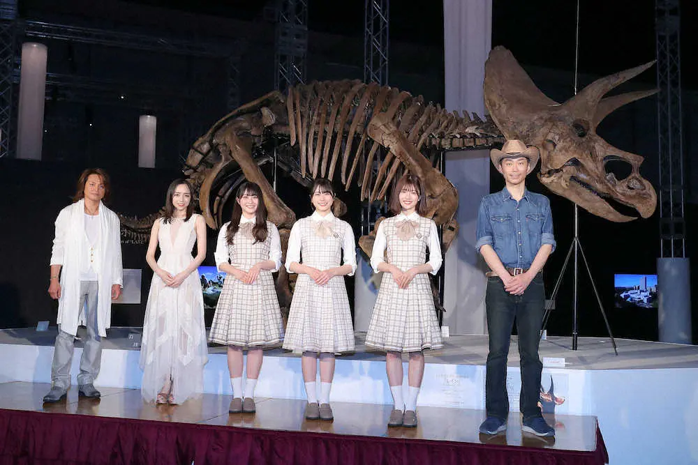 記念撮影に臨む(左から)DAITA、宮本笑里、日向坂46の潮紗理菜、丹生明里、松田好花、サイエンスコミュニケーターの恐竜くん(撮影・河野 光希)