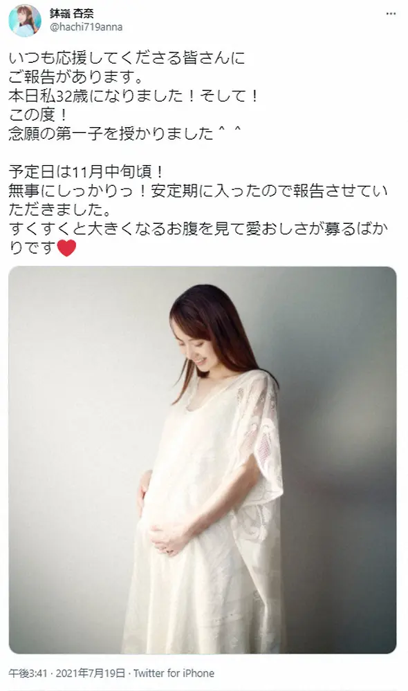 19日に32歳の誕生日を迎え「そして!この度!念願の第一子を授かりました 予定日は11月中旬頃!無事にしっかりっ!安定期に入ったので報告させていただきました。すくすくと大きくなるお腹を見て愛おしさが募るばかりです」とつづり、ふっくらしたお腹をいとおしそうに見つめる画像を公開した。