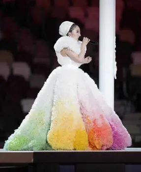 国立競技場内に「君が代」が流れるなか、ステージ上で伸びやかで力強い歌声を披露した。