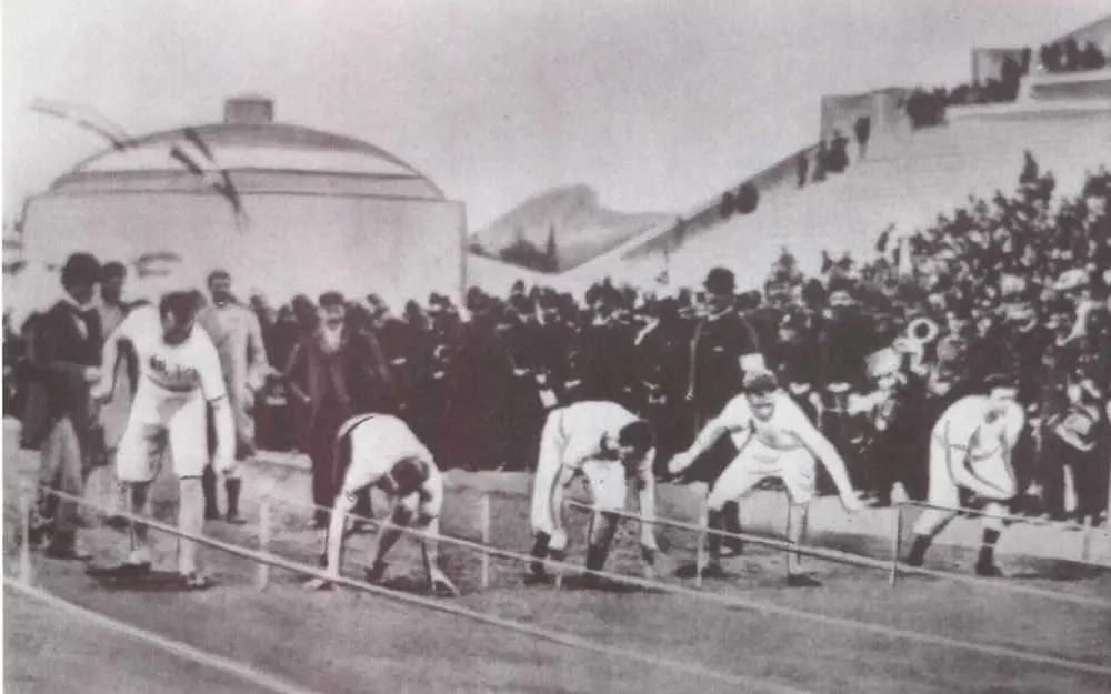 陸上は第1回大会でも花形競技でした。しかもいまと同じで米国が圧倒的に強く、全11種目中、9種目を制しました。人気の100メートルも米国のトーマス・バークという大学生が優勝。ただ一人、クラウチングスタートをしたことで注目を集めた選手でした。
