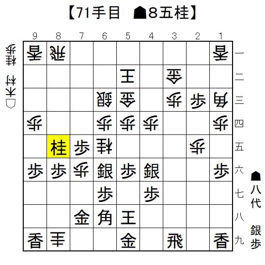 八代が選んだ一手は71手目▲8五桂。