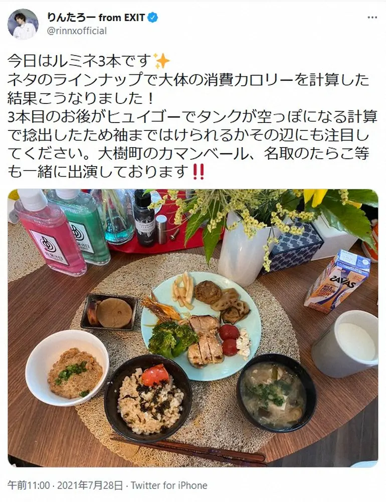 EXITのりんたろー。 Photo by スポニチ りんたろー。 カロリー計算をした手作り朝食に「理想的な食事」「バラン… ギャラリーで見る この記事のフォト 2021年07月29日の画像一覧 もっと見る 2021年07月29日の画像をもっと見る