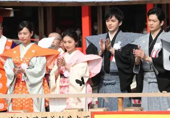 20年2月、大阪成田山不動尊節分会で豆まきをする大島優子と林遣都