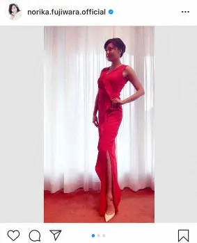 この日は、「変身」と記し、赤いスリット入りのノースリーブドレスを着て、腰に手を添えポーズを決めた華麗な全身ショットを披露。スリットからは、白いヒールを履いた自身の美脚が覗いている。さらに藤原は、「#修正無し」とハッシュタグをつけ、写真を加工していないことを明かした。