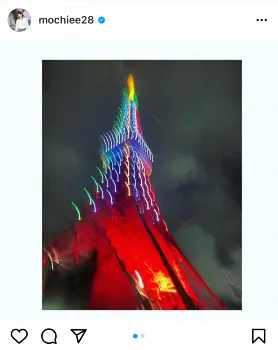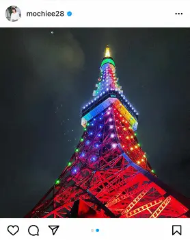 「いつかの東京タワー。オリンピックカラーです。写真がブレてるせいでてっぺんが聖火に見えませんか?100歩譲って…見えますよね?次はパラリンピックの時に見られますかね。たまたま特別なライトアップに出会うと嬉しい」とつづり、1枚目には少しぶれた写真を2枚目にはピントの合ったオリンピックカラーに点灯する東京タワーの写真を公開した。