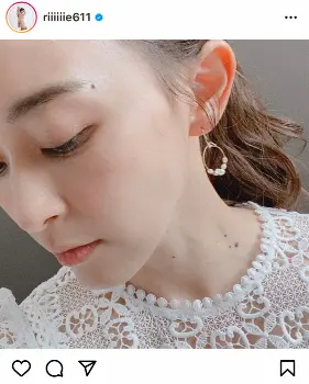 「おはようございます。ビーズピアス、お友達手作りなのです。可愛いです。ありがとうございます」とつづり、ビーズがあしらわれた丸い形のピアスを装着した姿の自撮り写真を投稿。トップスの首元の部分は白のレース生地で夏らしいデザインになっており、髪は1つに束ねられている。
