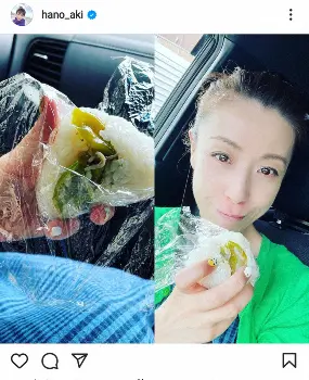 羽野はおむすびを口元に持った写真を投稿し「今日は午前中から稽古へ向かうが、夏休み中の寝坊助が多いので、車中でおむすびをかじる。中身は昨夜の残り物」と説明。さらに「写メとる私に娘から『顔の近くにおむすびを入れたら小顔に写るから、そう言うのインスタ詐欺だから』だそうです」と続けた。