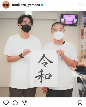山名は「幕張の空き時間『令和』書いた。石井くんに見てもらった」と、達筆な字で「令和」と書いた紙を、お笑いコンビ「コマンダンテ」の石井輝明(36)と一緒に持った写真を投稿した。