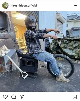インスタグラムでバイクのパーツが増えていく様子を公開しているヒロシ。今回は「月刊バイク。今月のパーツ。リアサス&角スコマフラー」とつづり、黒いヘルメットをかぶり、ハンドルの部品を両手で持ちカメラを見つめる写真を投稿。スコップをマフラーに見立て、さもバイクに乗っているかのようなシュールな1枚になっている。