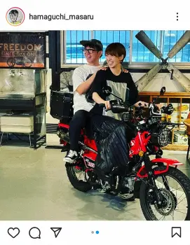 濱口はハッシュタグで自身の公式ユーチューブチャンネルである「濱口優と秘密基地」などと記すと、室内に止められているカスタムされた愛車に自身が前、南が後ろでまたがるショットと、南が前で自身が後ろでまたがるショットを投稿。笑顔あふれる2枚となった。ユーチューブチャンネルでは「【バイク】奥さんにカスタムをお披露目」と題して南に愛車を紹介する動画を公開している。