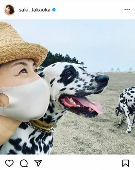 「暑いね~蒸すね~先日の海での私たち。海でもマスク…仕方ないね。とにかく、とにかく上を向いて頑張ろ~」(原文ママ)とつづり、愛犬のダルメシアンとの海辺でのショットを投稿。高岡は夏らしい麦わら帽子をかぶり、口元にはしっかりマスクを着用している。