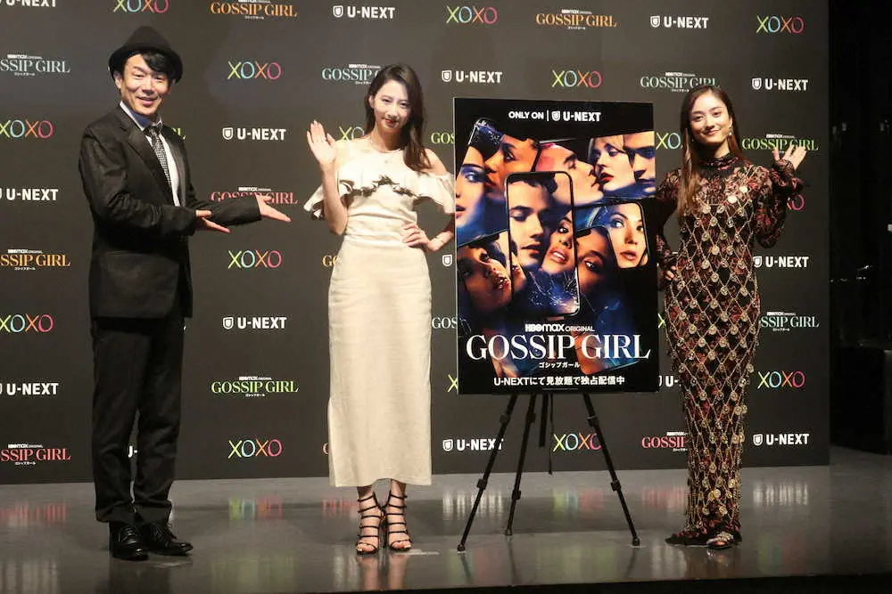 ニューヨークの富裕層エリアで暮らす若者たちの過激な生活を描く。作品をイメージし、肩出しのワンピースで登壇。「(内容が)今回はストリート寄りということで、カジュアルな生地感のものを選びました」とポイントを語った。タレントの谷まりあ(26)も歩くと音がなるほど装飾がついたドレスで登壇した。