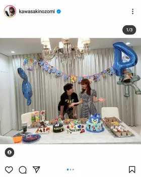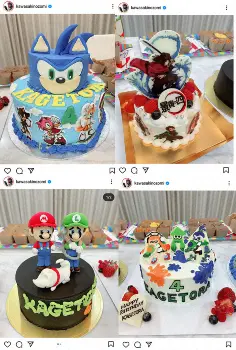 川崎は何と「ソニックシリーズ」「スプラトゥーン」「ルイージマンション」「鬼滅の刃」と4種類のデコレーションケーキの写真を投稿し「ケーキは全部違うお店で注文したよん 3才の誕生日のはトーマス一筋だったからトーマスケーキだったんだけど今回はおちびーぬ(景寅くん)の好きなキャラクターが多すぎて 私がどれにするか選べなくて1つのケーキにまとめられないなと思って4つになりました笑」と理由を説明した。