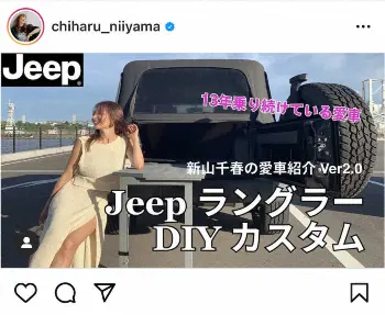 「今回のYouTube 13年乗り続けているjeep ラングラーをDIYカスタムしたので是非見ていただけたら嬉しいです」とつづり、後ろ部分にテーブルを取り付けた愛車との2ショットをアップした。