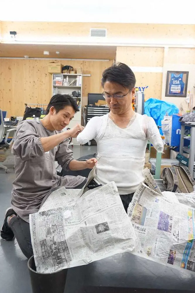 義手の採型を行う沖野敦郎さん(左)と乙武洋匡氏