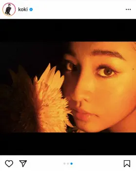 「Sunflower」とつづり、ひまわりに顔を寄せてカメラを見つめるショットを投稿。Koki,はドアップで写っており、この写真は「Pic by sis」とCocomi撮影であることも記している。