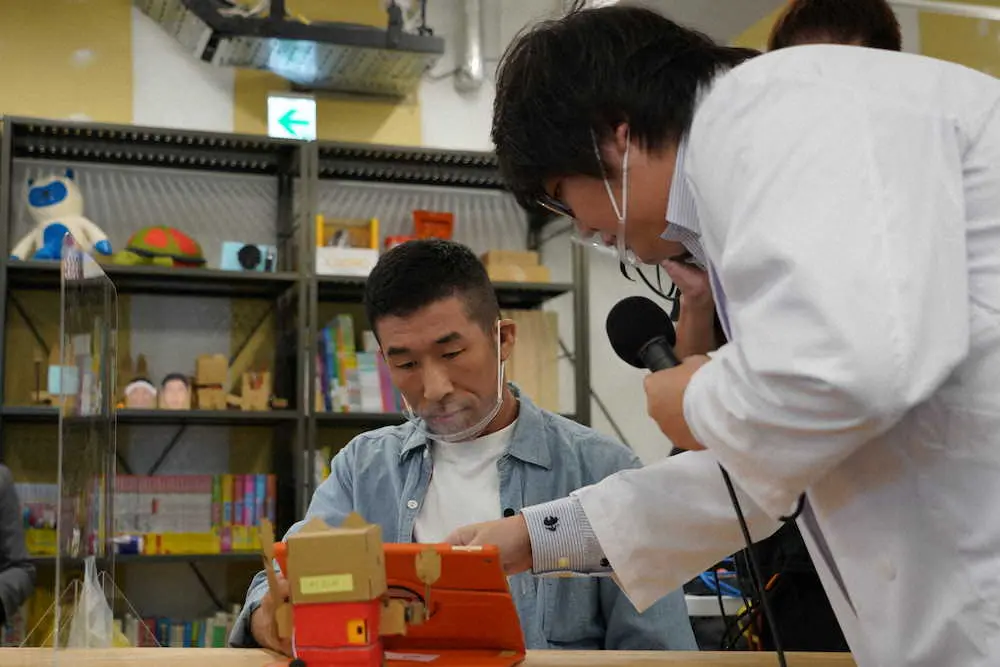 「e-Craft事業発表会 with よしもとパパ芸人」の記者発表会に出席した田村裕は、レクチャーを受けながらロボットのプログラムを制作する