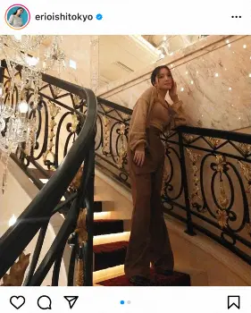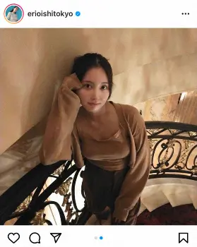 大石は「秋色」とつづり、らせん階段の手すりに寄りかかった姿でブラウンで統一した秋色コーデの写真を投稿した。2枚目には上から撮ったショットを投稿している。