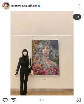 Cocomiは長い黒髪に黒のブラウスにパンツのブラックコーデで絵の横に立ち「二科展に行ってきました!その後に素敵なコンサートも聴きに行けて素敵な日でした。インスピレーション!さあ頑張るぞ」とつづり、母の絵や音楽からインスピレーションを受けたことを報告した。