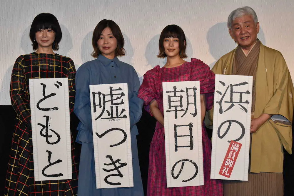 映画「浜の朝日の嘘つきどもと」の公開記念舞台あいさつを行った(左から)タナダユキ監督、大久保佳代子、高畑充希、柳家喬太郎