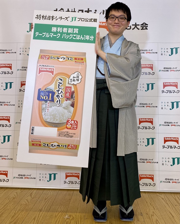 JT杯2回戦第3局で糸谷哲郎八段に勝利し勝利者副賞を手にする永瀬拓矢王座