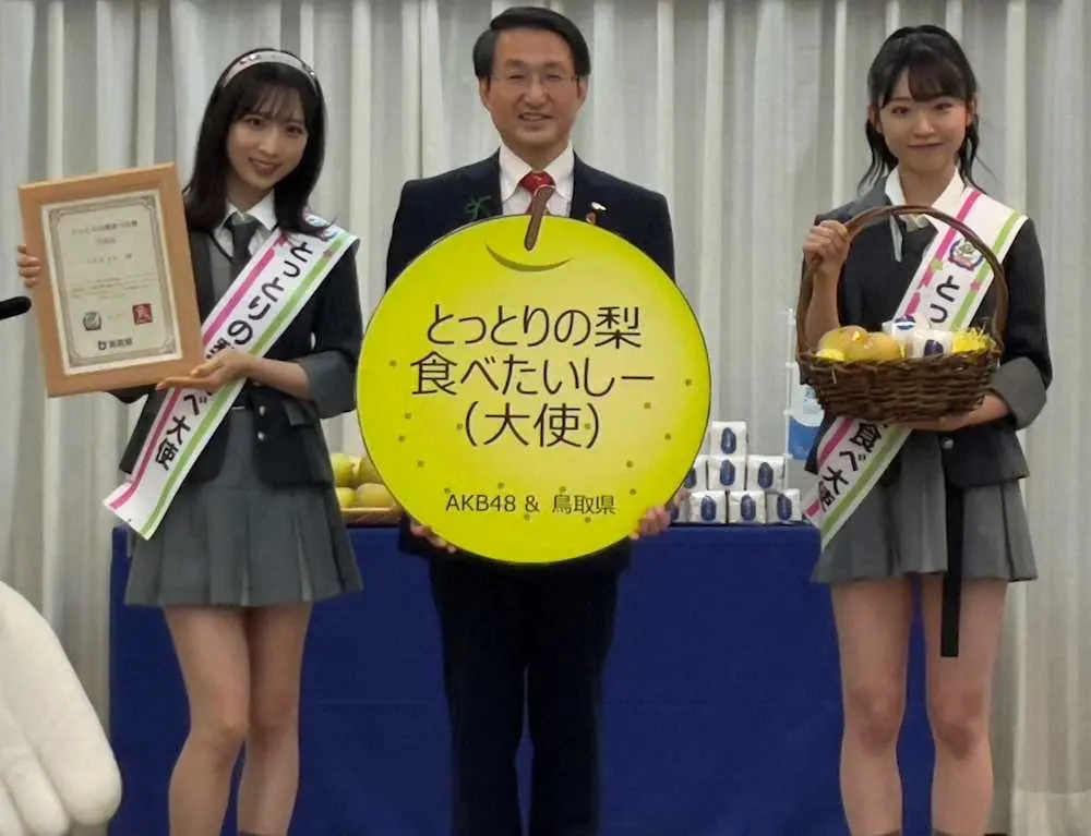 平井鳥取県知事(中央)と梨をPRするAKB48小栗有以(左)と山内瑞葵