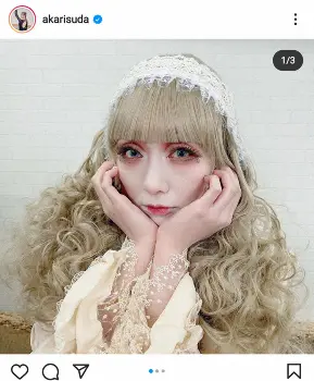 須田はロングの金髪の巻き毛ウイッグに、カラーコンタクトやつけまつげで“激盛れメーク”をほどこした写真を投稿した。11日に放送された読売テレビ系「THE完全犯罪」内のコーナーで披露したものとし、この日は半分メークを落とした姿も披露した。