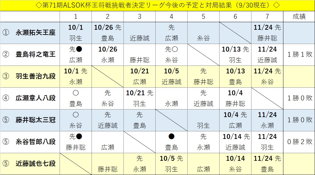 「王将リーグ」は、前期挑戦者の永瀬拓矢王座、前期リーグ残留者の豊島竜王、羽生善治九段、広瀬八段、2次予選通過者の藤井聡太3冠、糸谷八段、近藤誠也七段の7棋士による総当たり戦。次戦はあす10月1日に▲羽生九段―△永瀬王座戦が予定されている。